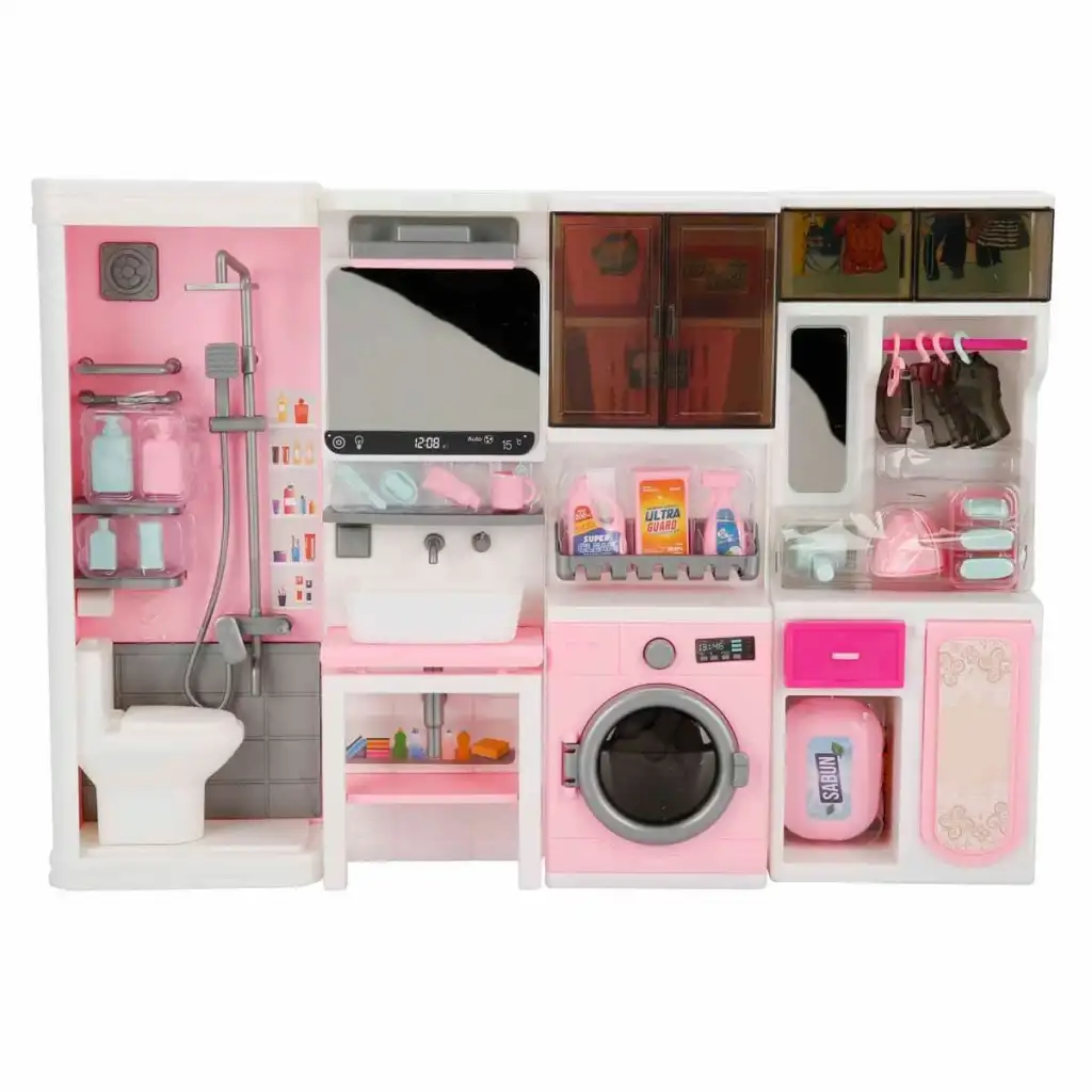 Banyo, çamaşır makinesi, lavabo ve ütü masası tek bir oyun setinde.